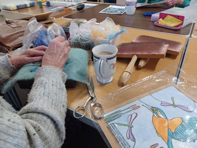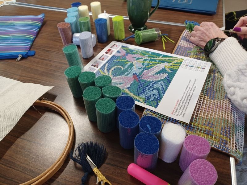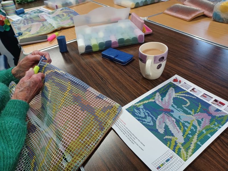 Today 6 of us started a Latch Hook Kit, which hopefully makes a Dragon Fly cushion! We were laying bets as to who would complete it first, and how many different versions of the same project we would create. Our first challenge was to master the use of the Latch Hook! Apparently by the time we complete our individual projects we will each have hooked approx 4,500 pieces of wool. I think we will be lucky to complete these in time for Christmas, only time will tell. We will ‘show and tell’ at the next Welcome to the Village event.