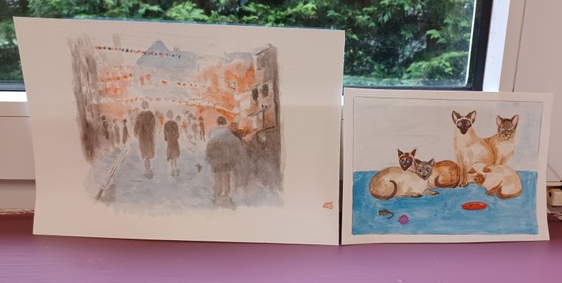 Today our theme was Sunset Over the Sea. I had a go with this and I have to say I was quite pleased with my attempt. My boat pier does need some work (basically covering over with white gouache and starting again…..) but I might have a go as the sunset bit is worth holding onto. I also brought my cottage back from last week, as it was now completed.